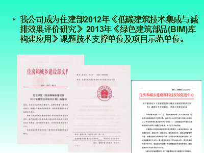 我公司成為住建部2012年《低碳建筑技術(shù)集成與減排效果評(píng)價(jià)研究》 2013年《綠色建筑部品(BIM)庫(kù)構(gòu)建應(yīng)用》課題技術(shù)支撐單位及項(xiàng)目示范單位。